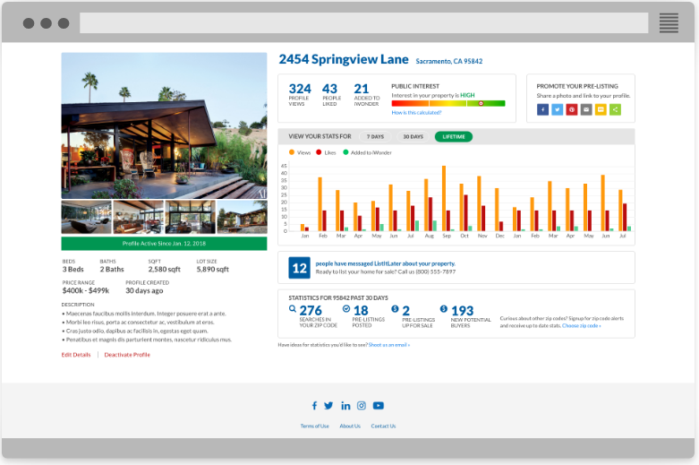 Get a clear picture of profile views, how many users like the property, how many want to be notified upon sale listing, and inquiries.